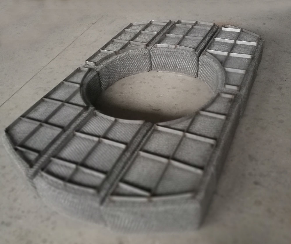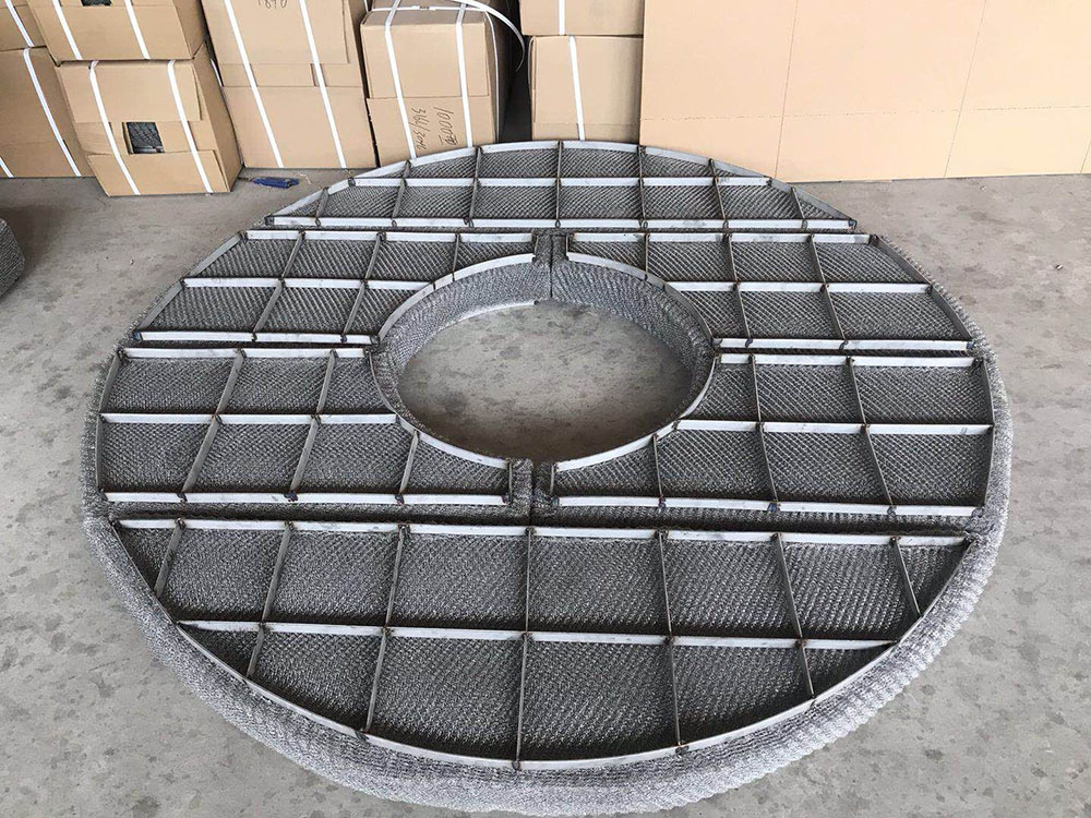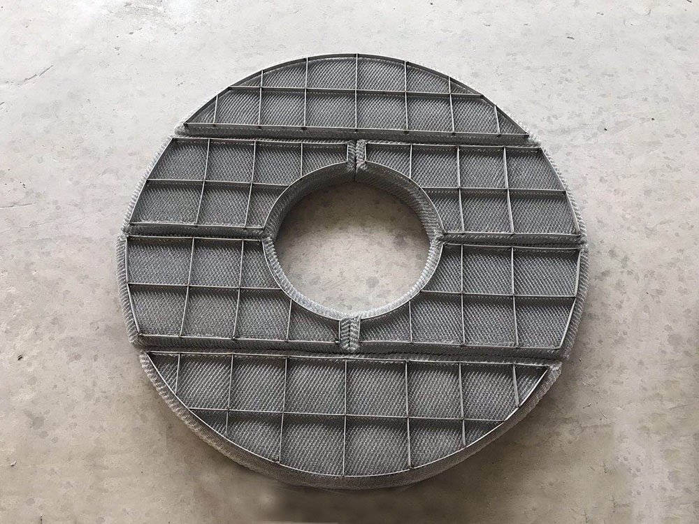 絲網(wǎng)除沫器主要是由絲網(wǎng)、絲網(wǎng)格柵組成絲網(wǎng)塊和固定絲網(wǎng)塊的支承裝置構(gòu)成,絲網(wǎng)為各種材質(zhì)的氣液過濾網(wǎng),氣液過濾網(wǎng)是由金屬絲或非金屬絲組成。氣液過濾網(wǎng)的非金屬絲由多股非金屬纖維捻制而成,亦可為單股非金屬絲。該絲網(wǎng)除沫器不但能濾除懸浮于氣流中的較大液沫,而且能濾除較小和微小液沫,廣泛應(yīng)用于化工、石油、塔器制造、壓力容器等行業(yè)中的氣液分離裝置中。