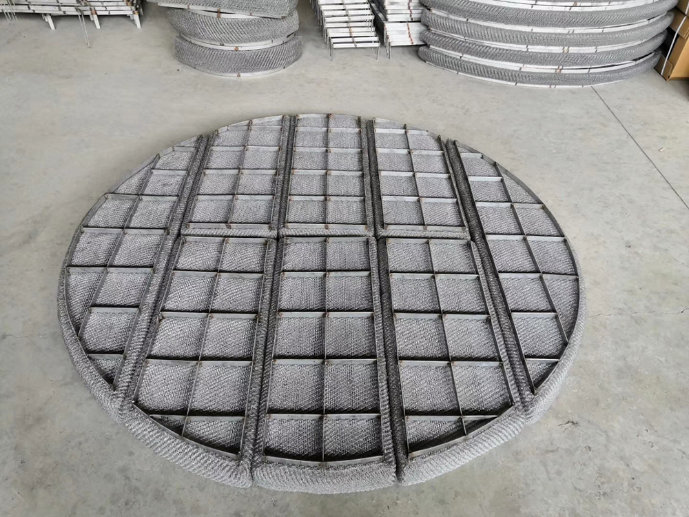 絲網(wǎng)除沫器主要是由絲網(wǎng)、絲網(wǎng)格柵組成絲網(wǎng)塊和固定絲網(wǎng)塊的支承裝置構(gòu)成,絲網(wǎng)為各種材質(zhì)的氣液過(guò)濾網(wǎng),氣液過(guò)濾網(wǎng)是由金屬絲或非金屬絲組成。氣液過(guò)濾網(wǎng)的非金屬絲由多股非金屬纖維捻制而成,亦可為單股非金屬絲。該絲網(wǎng)除沫器不但能濾除懸浮于氣流中的較大液沫,而且能濾除較小和微小液沫,廣泛應(yīng)用于化工、石油、塔器制造、壓力容器等行業(yè)中的氣液分離裝置中。